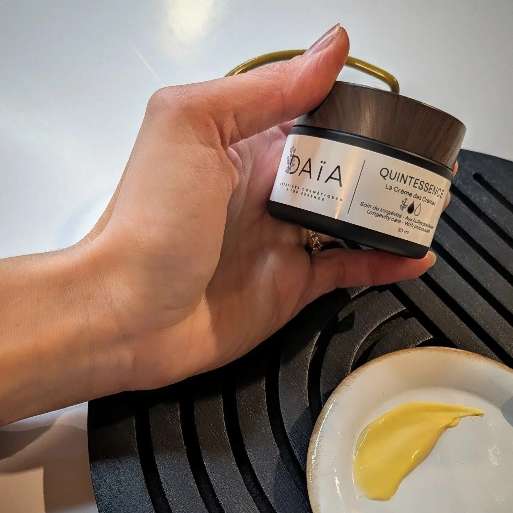 Une main tient un pot de crème de visage DAIA QUINTESSENCE sur une surface blanche, avec une assiette blanche contenant une petite quantité de crème jaune à côté, le tout placé sur un tapis noir à rayures.